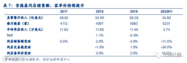 受客单价提升驱动,肯德基近年来同店销售额持续提升。2018年肯德基同店销售额增长2%,其中同店客单价提升3%,而交易数下降1%;2019年同店销售额增长4%,其中同店客单价提升3%,交易数增加1%,显然销售额受客单价提升影响较大。2020年上半年受疫情影响,虽然客单价提升(或因成本上升而进行产品提价),但同店销售额仍下降11.0%,预计随着餐饮行业景气度的恢复,肯德基同店销售额仍有望稳定和提升。