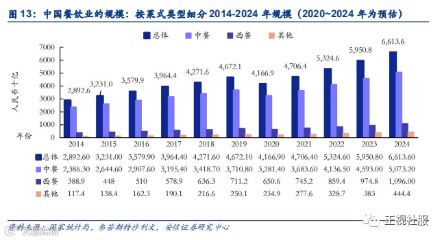 按菜式细分市场表现:现阶段中餐规模占优,西餐成长速度领先。中餐市场占中国餐饮业的比重最大,2019年的市场份额为79.4%。中餐的市场规模由2014年的23,863亿元增至2019年的37,108亿元,CAGR为9.2%。西餐为迅速增长的细分市场,由2014年的3,889亿元增至2019年的7,112亿元,CAGR为12.8%,并预期以9.0%的CAGR于2024年增至人民币10,960亿元。西餐餐饮发展势头迅猛,有望在中国未来餐饮市场继续分羹。