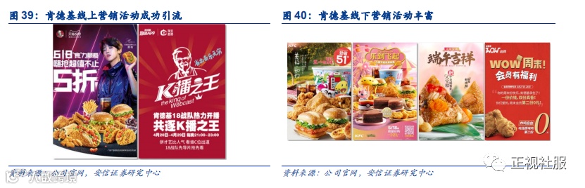 肯德基通过线上和线下双管齐下的方式进行营销,为品牌带来了更多的客流。①线上:与淘宝、天猫等电商平台进行合作,直播带来品牌流量。肯德基与淘宝直播联合开启“K播之王”,成功为品牌线上引流争取关注度;618期间再度在天猫及APP上进行促销活动,以新零售的方式增加产品销量。②线下:提供常规、节假日超值促销套餐,竭力为顾客实现卓越的价值定位:公司推出多个超值套餐活动,如肯德基疯狂星期四,其于星期四以优惠价格向所有顾客提供核心产品。除常规促销以外,针对节假日推出限定优惠产品,如儿童节套餐,能够为品牌在节假日期间带来更高的客流及客单。