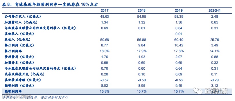 肯德基经营能力较为优秀,近年经营利润率水平基本稳定在16%左右,并且在疫情之下仍实现盈利。2017/2018/19年肯德基餐厅经营利润率为15.8%/15.7%/15.7%,基本稳定在16%左右;2020年上半年受疫情影响,餐饮行业普遍受到较大冲击,肯德基仍凭借其优秀的运营能力(主要体现在出色的外送体系上,肯德基是国内最早推出无接触配送的餐厅之一)实现了了14.1%的餐厅利润率和12.1%的经营利润率,体现了老牌餐饮的强劲生命力。