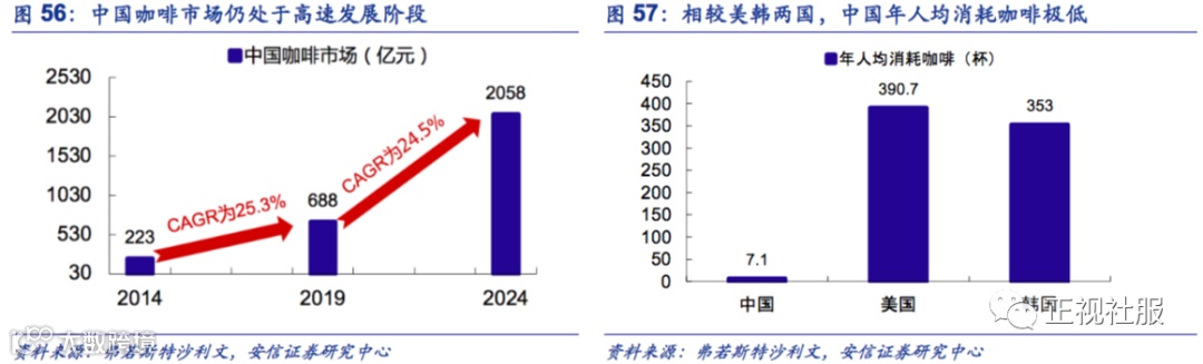 中国咖啡市场仍处于高速发展阶段,国内年人均消耗咖啡杯数较低,市场潜力大。中国咖啡市场的零售销售收入(指咖啡产品经所有渠道售出的零售额)由2014年的人民币223亿元增至2019年的人民币688亿元,复合年增长率为25.3%。尽管增长迅速,但与美国及韩国相比,中国咖啡市场的渗透率严重不足。2019年,中国每年人均仅消耗7.1杯咖啡,而美国及韩国则分别消耗390.7杯及353.0杯。受中国消费升级、新销售模式的发展及咖啡饮用的习惯形成所带动,预期中国咖啡市场将由2019年以复合年增长率24.5%增至2024年的人民币2,058亿元。国内咖啡市场以星巴克、Costa、瑞幸咖啡、Tim Hortons等为主,公司以COFFii & JOY和塔可贝尔进行试水,后续能否突围成功仍需关注。