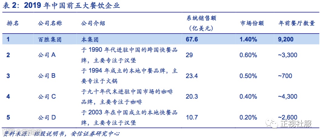 中国餐饮业份额高度分散,尚未形成具有垄断地位的餐饮企业,百胜中国具有一定领先地位。根据弗若斯特沙利文数据,2019年底中国的快餐市场约有300万至350万家公司,以系统销售额计算前五大公司的市场份额少于5%,呈现出高度分散的态势。其中,百胜中国为最大的餐厅公司,其系统销售额为67.6亿美元,市场份额为1.4%,具有一定领先地位。