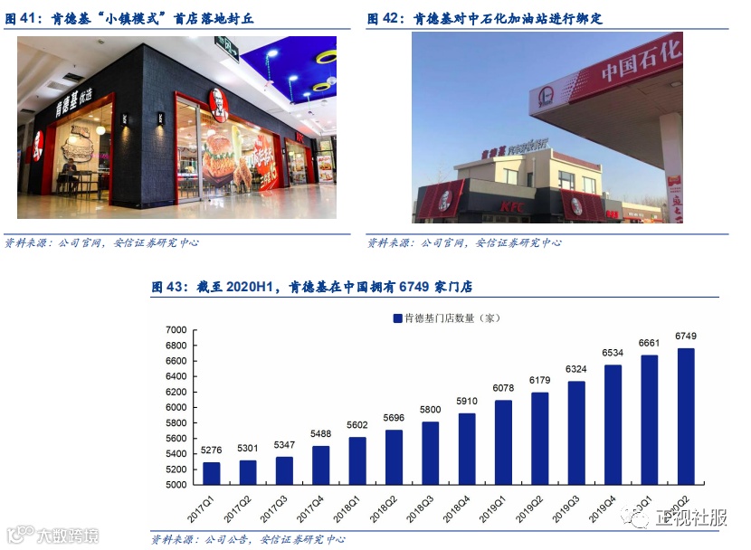 一二线城市餐饮市场日趋饱和,下沉市场未来回报可观,“小镇模式”助力百胜中国抓住新的机遇。我们认为肯德基仍然具有下沉空间的主要原因有:①下沉市场较广且成本低:肯德基目前覆盖城市多属一二线城市,人均消费水平高,竞争对手众多。相比之下三线及以下城市的开店成本更低,可以拿到更优质的商铺、更低的租金、更高的坪效和利润,存在较大的市场空间。未来一段时期内,肯德基会将注意力集中于下沉市场,即三线及以下城市餐饮市场的扩张。②现金回收期限较短:新肯德基餐厅的平均现金回收期分别约为两年,而中国的业内平均回收期则为三至五年,相比之下肯德基具有一定优越性。③精选县城能够保证盈利:2020年8月,肯德基利用“小镇模式”在河南新乡封丘县开设了第一家“小镇店”,成功通过精简化的餐厅环境、菜品种类赢得了当地消费者的喜爱。细究之下,封丘县拥有80万户籍人口,2019年GDP达到了233亿元,人均GDP3.25万元,居民生活状况良好。换言之肯德基选择下沉必定会精选类似封丘的县城,以达到缩短投资回报期、盈利等目标。④绑定商业实体加速展店:肯德基于2019年与中石化、中石油签订协议,将会在中石油、中石化所运营的加油站内开设肯德基加盟店,对商业实体进行绑定。截至2019年底,中石化及中石油在中国拥有50000多个加油站,未来肯德基有望借此进行快速扩张。截至2020H1,肯德基在中国拥有6749家门店(含加盟),根据中国商报报道,肯德基团队预计2020年后的三年内将会在中国下沉市场新增约1000家“小镇店”。