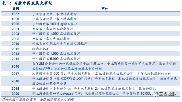 1)肯德基:肯德基于1939年在美国创办,并于1987年在中国北京开设了其于中国的第一家餐厅。截至2020年Q3,肯德基在中国一共有6925家餐厅,是公司业绩的主要支撑品牌。