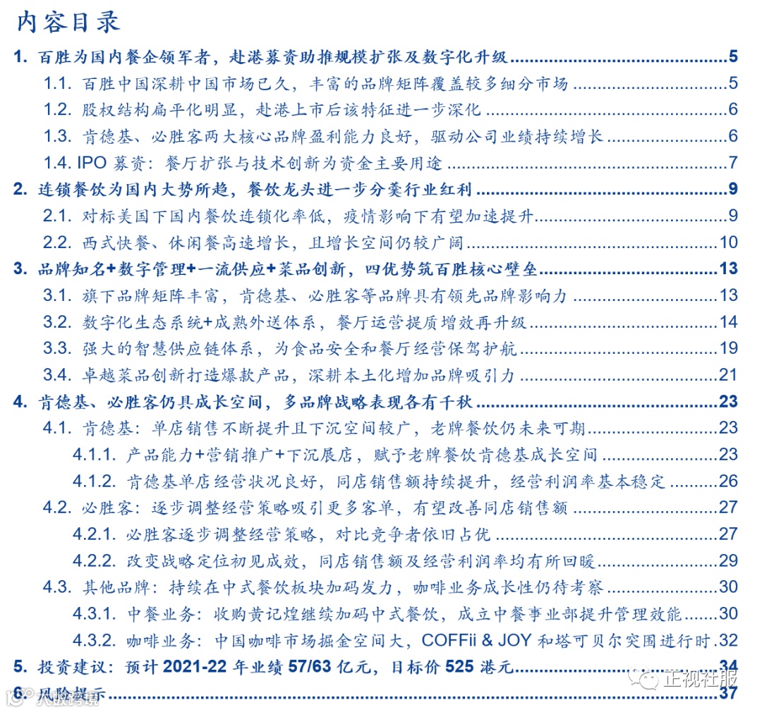 公司旗下品牌在细分市场中表现强劲,享有较高的品牌知名度。根据弗若斯特沙利文调研:①肯德基为快餐细分市场中最大餐饮品牌:2019年底中国快餐市场约有300万至350万家公司。以2019年系统销售额(包括加盟店及自营餐厅的销售额)计算,肯德基为中国最大的快餐品牌,市场份额约4.9%。肯德基于中国的主要竞争对手包括麦当劳等多家西式快餐公司。②必胜客、黄记煌在休闲餐饮细分市场具有较大影响力:2019年底中国的休闲餐饮市场约有75万至78万家公司。以2019年系统销售额计算,必胜客为中国最大的休闲餐饮品牌,市场份额为2.7%,必胜客的主要竞争对手包括西式休闲餐饮品牌以及其他本地休闲餐饮品牌;以2019年系统销售额计算,黄记煌为中国第二大的休闲餐饮品牌,市场份额为0.5%,为中国第二大的休闲餐饮品牌。目前中国餐饮市场仍呈现出高度分散化的态势,强大的品牌知名度将有助于餐饮品牌加深消费者印象并打开不同地区的市场。公司旗下拥有的肯德基、必胜客等品牌具有极高的知名度,能够为公司整体品牌矩阵注入活力,一定程度上形成协同效应,助力其他品牌齐头并进。