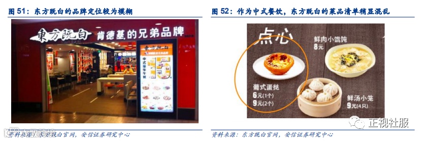 东方既白:定位较模糊、菜品不丰富,公司中餐领域第一枪处于尴尬境地。2004年5月,百胜中国在上海开出了第一家中式快餐店“东方既白”试水。作为公司在中餐领域的“第一枪”,东方既白的经营上有着定位模糊、菜系混乱等不足,例如品牌一直在宣传气味“肯德基的兄弟品牌”,难以给消费者带来中式快餐的深刻印象。其次,作为中餐品牌,东方既白菜品清单中常出现“中西混杂”的情况,使得原本模糊的定位更加混淆。故东方既白的发展每况愈下,截至2020年6月30日,全国东方既白餐厅数量仍仅有11家,后续发展或需公司重新对品牌进行战略定位和构想。