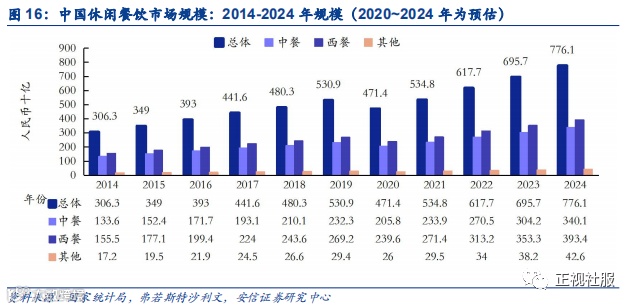 2)休闲餐饮市场为中国餐饮业中近年增长最快的餐厅服务类型。根据弗若斯特沙利文数据,其在整体市场的占比不断增加,由2014年的约10.6%增加至2019年的约11.4%,并预期于2024年增至约11.7%。休闲餐饮的细分市场规模由2014年的人民币3,063亿元增至2019年的人民币5,309亿元,并预期于2024年增至人民币7,761亿元,休闲餐饮市场受到中国人口消费升级及更多重视高质量用餐体验所带动。到2019年,西餐占中国休闲餐饮市场规模的50.7%,而中餐的市场份额则为43.8%。2019年至2024年,预期西餐及中餐均以复合年增率7.9%增长。与正餐相比,休闲餐厅营业时间较长,供应餐饮时间亦更具弹性。在消费升级的前提下,人们出于满足精神需求、缓解工作压力等原因愈发倾向选择休闲餐饮,是促进休闲餐饮业发展的重要驱动力。