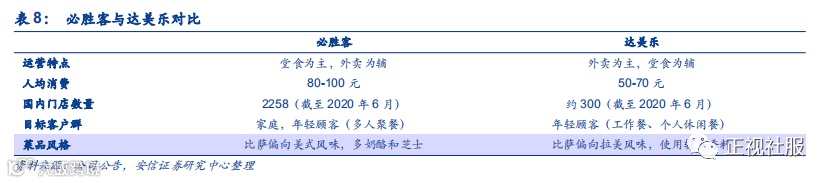 对标另一披萨巨头达美乐的经营策略,必胜客仍有补足空间。达美乐比萨是创立于美国的比萨连锁店,在中国由上海达美乐比萨有限公司进行运营和管理。达美乐的运营模式有以下特点或优势:①以外卖业务为主,门店成本较低。达美乐在中国市场线下实体门店极少,仅有300多家,主要通过外卖业务营利,而且其外卖配送服务较为优质,配送速度约为国内其他外卖平台的平均配送速度的两倍。受公共卫生事件的影响,消费者更愿意选择外卖而不是堂食服务,中国餐饮业的外卖业务快速成长,达美乐在外卖业务的优势预计将为其营收与扩张带来明显的促进作用。同时,由于达美乐专注于外卖业,实体门店较少,店铺租金等方面的成本费用较低,也进一步强化了其盈利能力。②客单价较低,主打年轻消费者。相较于必胜客的“欢乐餐厅”概念主要面向家庭和多人聚餐场景,达美乐定位在年轻消费者的工作餐和个人休闲餐场景,场景复现频繁空间较大。同时达美乐人均消费更低,更加迎合年轻消费者的消费习惯,占有一定优势。必胜客后续经营策略或可以借鉴达美乐模式,增加外卖、外带在收入中的比例以减少门店运营成本,并调整餐厅定位进一步降低客单价和提升客单成交量,提升同店销售额。