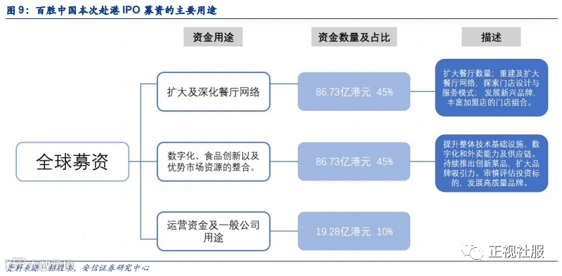 公司于2020年9月于香港证券交易所上市,按照指示性最高公开发售价计算,百胜中国此次可募集资金净额约为192.74亿港元,假如超额配股权获得全数行使则为221.78亿港元,所募集资金的主体部分将会用于以下用途:①餐厅网络的扩大与深化:所募集资金的45%,约86.73亿港元,将会用于巩固现有餐厅业务以及开拓新市场。公司将继续追踪800多个尚未被肯德基或必胜客餐厅覆盖的中国城市,探索新的经营模式、服务模式,争取达成未来餐厅数目20000家的扩张目标。②数字化、食品创新以及优势市场资源的整合:此项涉及所募集资金的45%,约86.73亿港元。公司将继续投资于数字化、自动化以及人工智能,通过完善整体技术基础设施,提升外卖能力以及供应链的完备程度。同时,公司计划持续推出创新菜品以满足消费者需求,更好地支撑餐厅的扩张计划,并通过严格的审核来确定未来的投资标的。③剩余10%资金约19.28亿港元将会用于企业运营以及公司一般用途。