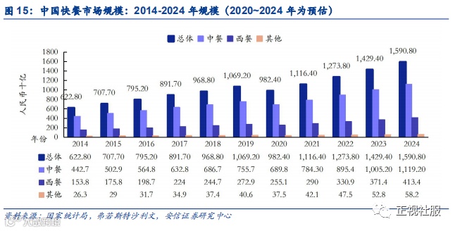 1)快餐市场在国内仍有较大的发展空间与潜力。根据弗若斯特沙利文数据,2019年中国每百万人中仅有约503间快餐餐厅,而美国则有约1,035间。随着快餐细分市场迅速增长,其在中国整体餐饮业的占比不断增加,由2014年的约21.5%增加至2019年的约22.9%,并预期于2024年达到24.1%。受城市化水平提高及消费者对食品安全及快速方便的快餐的需求增加所带动,快餐细分市场由2014年的人民币6,228亿元增至2019年的人民币10,692亿元,并预期于2024年增加至人民币15,908亿元。于2019年至2024年,预期西餐以复合年增长率8.7%增长,而中餐将以复合年增长率8.2%增长。2019年西餐占中国快餐市场规模的25.5%,而中餐则占70.7%,以肯德基为例的西餐快餐相较中餐快餐有着加工工序较为简单的特点,随着中国餐饮市场的不断发展,西餐有望在中国快餐市场中占据越来越重要的地位。