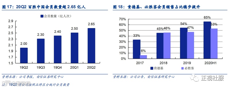百胜中国拥有国内首屈一指的会员数量,支撑总销售的半壁江山。公司在业务数字化方面已领先行业,通过其创建的数字化生态系统持续为业务赋能,驱动销售的同时不断提升消费者体验。截止2020Q2,百胜中国公布其会员数量已经超过2.65亿,其中肯德基会员数超过2.4亿,必胜客会员数超过7500万,会员销售已经在整体销售额中占比超过60%,数字化点餐占比约80%。会员作为忠诚度和客单价较高的客户群体,是公司宝贵的可持续运营资产,体量庞大的数字化会员和数字化运营带来的ARPU持续增长,构成了百胜中国业绩增长的底层基础。而作为多品牌经营的平台,百胜中国的数字化会员还拥有独特的优势——不同品牌的会员体系交叉,使得会员标签画像更加完善。而超过2.65亿的数字化会员的积累,也为百胜中国的跨品类、多品牌扩张提供了强大的竞争优势。