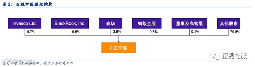 百胜中国的股权结构扁平化,大股东持股比例较低且相互差距较小,大部分股份则由其他公众股东所持有。公司最大股东为Invesco和BlackRock,分别控股10.8%和7.2%,第三大股东为春华控股4.3%,其余股份由董事及高级管理层和其他公众股东持有,占总股份77.7%。百胜中国于2020年9月在香港证券交易所上市后,股权的扁平化程度略有加深,最大股东仍为Invesco和 BlackRock,但控股比例分别下降至9.7%和6.5%,第三大股东仍为春华控股,掌握3.9%股份,其余股份由董事及高级管理层和其他公众股东持有,占总股份79.9%,较发售前上升了2.2%。