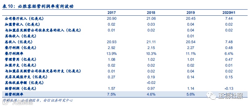 积极调整定位后,2019年必胜客同店销售额及经营利润率均有所回暖。2018年受竞争加剧的影响,必胜客同店销售额同比下降5%,其中同店交易数和客单价均下降2%,经营利润率为4.6%/-2.9pct;2019年起通过优惠促销等活动对品牌进行定位调整,同店交易数大幅上升7%,客单价下降6%,同店销售额小幅改善+1%,经营利润率也小幅回暖至5.6%/+1.0pct;20H1受疫情影响,同店销售额下降22%,经营利润率为-1.7%。随着必胜客定位的进一步调整,同店销售额和经营利润率有望企稳回升,焕发老牌餐饮的新一春。