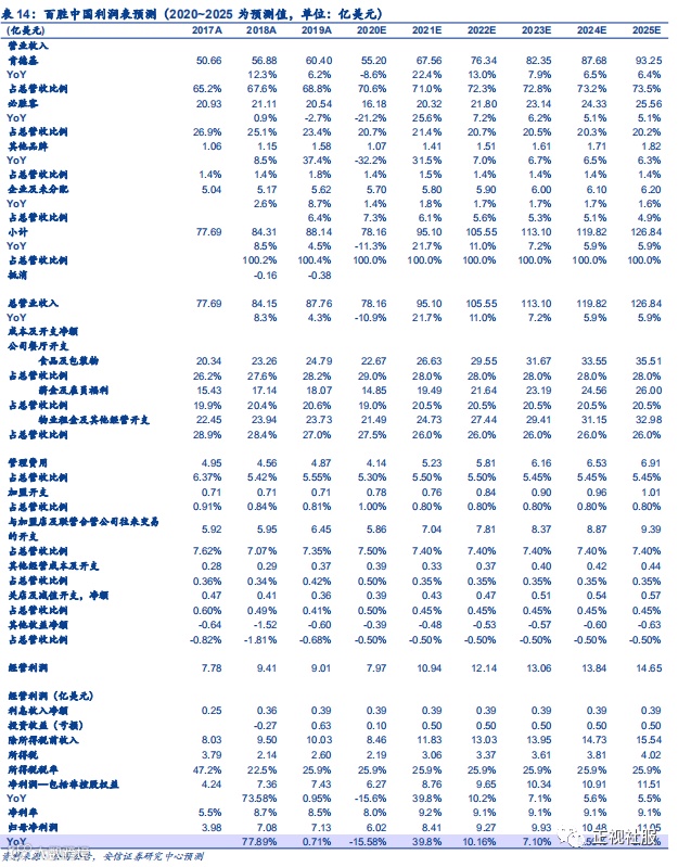 ■肯德基、必胜客展店和同店均仍有较好潜力,多个新品牌持续加码发力。①肯德基:下沉展店+外卖助力打开成长空间。1)产品+营销:肯德基主打广为消费者喜爱的炸鸡和汉堡等产品,同时还推出了诸如嫩牛五方、十三鲜小龙虾堡等爆款产品,辅以公司成熟的线上推广+线下促销+外卖配送,在餐饮行业持续拥有强劲的竞争力。2)展店规模:肯德基目前的展店策略已从一二线城市持续往下沉市场开拓,叠加强品牌力带来的租金优势、客流红利、快速爬坡等优势,实现了较快的现金回收期。结合肯德基2017-2019年年均新开460家餐厅的扩张速度估算,我们估测肯德基在中国市场的餐厅数量有望在未来的3-4年内或有望突破9000家;3)单店增长:肯德基经营能力较为优秀,受客单价提升和外卖业务驱动,几年来同店销售额持续提升,2017-2019年同店销售额同比5.0%/2.0%/4.0%,同时经营利润率较高,2017-2019年餐厅经营利润率为15.8%/15.7%/15.7%。②必胜客:调整经营策略,单店模型有望改善。必胜客通过与多方合作营销、加大线下促销力度等方式积极调整餐厅定位,逐步降低客单价,2019年必胜客盈利模型优化回暖,2017-2019年必胜客餐厅同店销售额1.0%/-5.0%/1.0%,经营利润率为7.5%/4.6%/5.6%,未来单店模型有望进一步改善推动品牌盈利性的展店空间改善,后续仍需持续跟踪。③其他品牌:公司2020年4月收购黄记煌后成立中餐事业部,持续对中式餐饮加码发力,同时以COFFii & JOY和塔可贝尔掘金中国咖啡市场,有望持续丰富公司的餐饮业态。