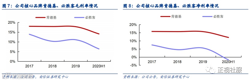 公司核心品牌肯德基、必胜客盈利能力良好,疫情承压下表现不俗。2017-2019年肯德基毛利率为17.9%/17.8%/17.8%,必胜客毛利率为13.9%/10.3%/11.1%,受疫情影响2020H1肯德基/必胜客仍保持正毛利率为14.1%/6.4%,表现出了强大的生命力;2017-2019年肯德基净利率为15.8%/15.7%/15.7%,必胜客净利率为7.5%/4.6%/5.6%,疫情之下肯德基/必胜客净利率为12.1%/-1.7%。