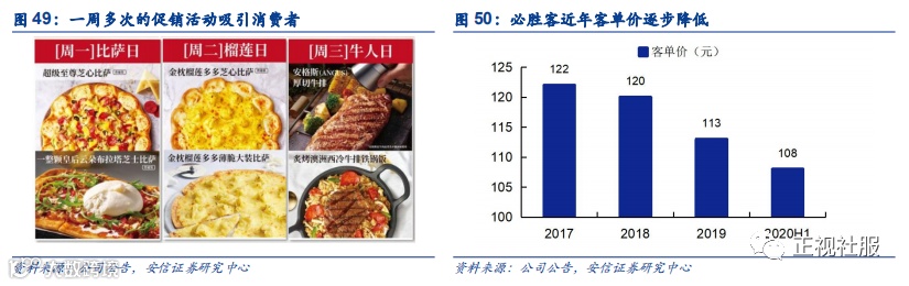 调整经营策略:推出众多促销活动,降低客单价换取更多客单成交,提升同店销售额。作为国内优秀的休闲餐饮品牌之一,必胜客以其独具特色的披萨产品在过往的业绩表现出色,随着中国消费不断升级,必胜客在同类品牌中逐渐失去竞争力:相比于更有特色、更精致奢侈的休闲西餐厅,必胜客在菜品、服务等层面不具优势,同时较高的客单价在下沉市场也不具备性价比优势。因此,必胜客逐步调整经营策略并已取得一定同店改善,近年来必胜客不断推出促销活动,例如在一周内设立周一比萨日、周二榴莲日、周三牛人日多个促销日,对多种产品进行促销;推出特惠一人食、两人食套餐,覆盖工作日午餐晚餐时段。而必胜客的客单价也从2017年的122元下降至2020H1的108元,同时同店客单也在2019年有所回暖。
