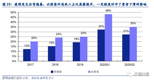 疫情催生更多外卖需求,公众或将养成外卖习惯,预计未来外送收入将成为业绩强力支撑点。新冠疫情的爆发导致2020H1餐饮行业堂食受影响较大,但同样孕育出大量的餐饮外卖机会,有望使公众加速养成外卖习惯。为应对新冠肺炎疫情,2020年1月肯德基及必胜客便在全国范围内推出无接触配送,能够减少疾病传播的风险,并且有助于拉动外送销售额。2020Q1/Q2肯德基外送收入占比为32%/48%,必胜客外送收入占比为48%/35%,较疫情前均有较大提升,随着外部环境转好占比或将有所回落,但由于公众习惯的养成预计外送收入仍会占总收入的较大比重。