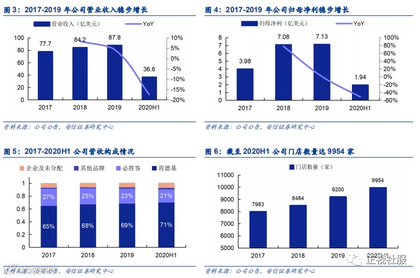 近年公司经营状况良好,营业收入与归母净利稳定增长,且疫情之下仍实现盈利。2017/2018/2019 年公司营业收入分别为77.7/84.2/87.8亿美元,归母净利为3.98/7.08/7.13亿美元,2019年公司总收入同比增加4.28%主要系肯德基的销售表现强劲,同店销售额增长4%及必胜客的同店销售额增长1%,同时公司门店新扩张1006家店铺开业。2020H1公司在疫情之下仍实现盈利,录得收入36.6亿美元,归母净利1.94亿美元,主要受益于公司外卖和到店自提业务贡献的超50%销售收入。公司的主要业绩支撑为肯德基和必胜客两大核心品牌,20H1二者收入分别占总营收的70.5%/20.5%,并将在可预见的未来继续驱动公司业绩增长。目前公司门店数量已达到9954家,根据招股书,公司计划未来达成20000家门店的建设目标,根据公司2020Q2季报指引,每年预期保持新增800-850家店面的速度。
