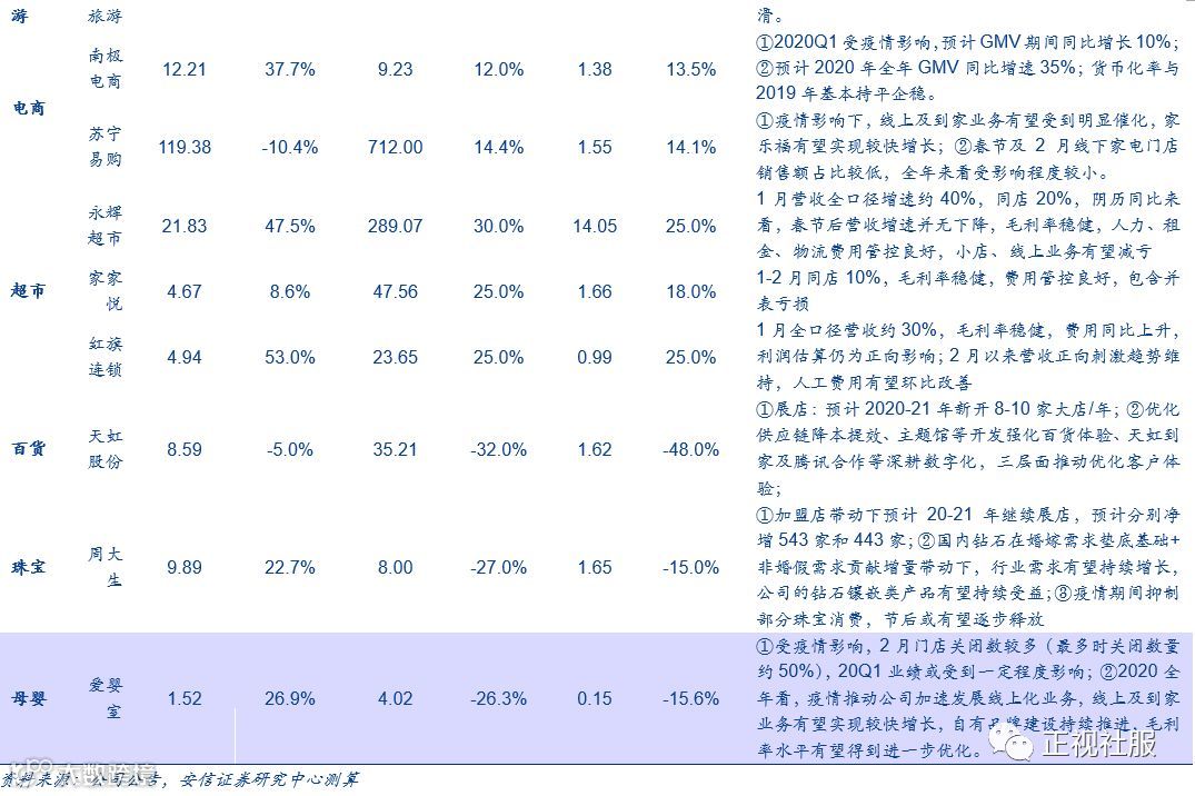 线上零售消费:受1-2月影响预计相对有限,后续3月销售有望快速恢复,且中长期线上消费渗透率有望进一步提升。1)化妆品行业:受影响程度较小,行业加速线上化。①化妆品基于其偏刚需、相对逆周期的属性受影响程度相对较低。华熙生物(业绩增速5~20%;为2020Q1业绩预测,下同):公司受影响较大业务为医疗终端产品销售,19Q1销售收入占总收入比例仅约25%;2020全年,原料业务有望稳健增长,功能性护肤品业务多品牌齐发、品牌矩阵逐步形成,有望保持高速增长。珀莱雅(业绩增速0~10%):公司线上占比较高,受影响程度或较小;已推出新品红宝石精华,有望贡献较大增量;2020年公司将发力彩妆彩棠品牌及西班牙品牌圣瑰兰等,品类及品牌拓展有望得到加速拓展。丸美股份(业绩增速-5~10%):公司线上占比逐步提升,受影响程度或较小;2020年更换TP、组建社媒团队,大幅加码线上运营,线上有望实现较快增长。壹网壹创(业绩增速20~40%):疫情影响下行业加速向线上转型,公司有望受益于业务需求高速增长;此外,公司跨赛道扩张意图明显,有望依托人才及规模优势推动超预期增长。②中长期看化妆品需求景气度高,行业有望持续高速增长。从行业格局来看,疫情驱动行业加速向线上转型,并有望加速中小玩家出清、市场集中度将进一步提升。2)线上电商:苏宁易购(收入增速-20~20%):线上及到家业务有望受到明显催化,家乐福有望实现较快增长;春节及2月线下家电门店销售额占比较低,全年来看受影响程度较小。南极电商:1-2月份GMV受物流运输影响同比增速或基本持平,但在2月中下旬开始随物流恢复和供应商复工GMV增速逐步环比改善,预计公司一季度GMV增速8~18%,一季度业绩增速预计5~15%;2020年全年GMV同比增速预计25%~40%,货币化率与2019年基本持平企稳。