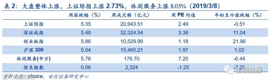 本周各主要指数:休闲服务上涨5.76%,上证综指上涨5.35%,深证成指上涨5.48%,创业板指上涨5.86%,沪深300上涨5.04%,恒生指数上涨0.06%。