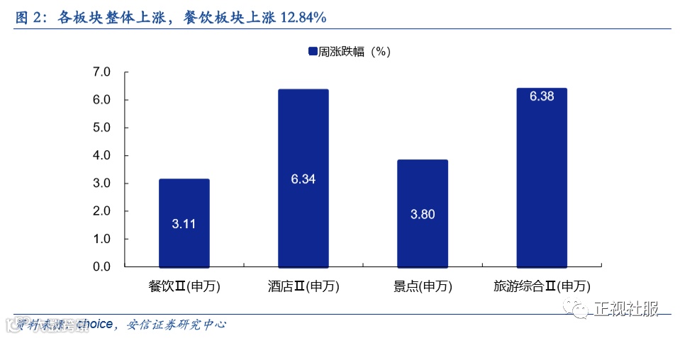 本周餐饮旅游各细分板块:旅游综合板块上涨6.38%,酒店板块上涨6.34%,景点板块上涨3.80%,餐饮板块上涨3.11%。