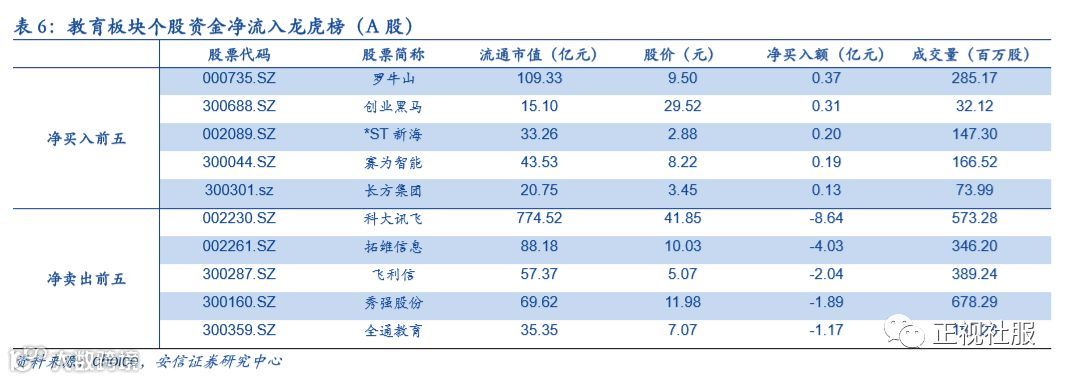 教育板块净卖出前五:科大讯飞(-8.64亿元)、拓维信息(-4.03亿元)、飞利信(-2.04亿元)、秀强股份(-1.89亿元)、全通教育(-1.17亿元)。
