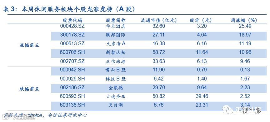 休闲服务跌幅前五:黄山B股(+0.13%)、锦旅B股(+1.67%)、全聚德(+2.23%)、大连圣亚(+2.52%)、天目湖(+3.14%)。