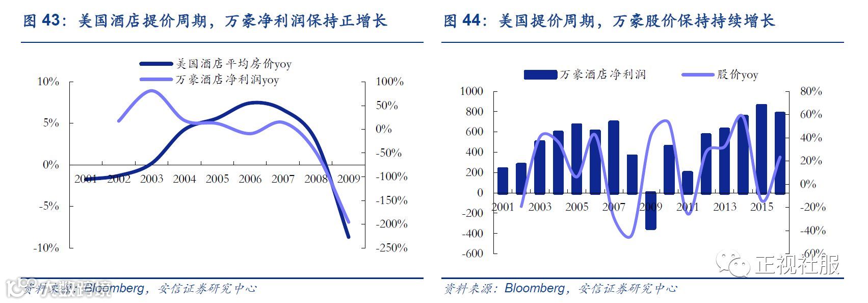 ■从二级市场来看,美国酒店提价周期,酒店板块二级市场表现优秀。①以2001-2006年美国酒店提价阶段为例,可以看到美国酒店板块录得绝对收益142.98%,同期标普500收益23.54%;年化看,2001-2006年酒店板块录得年化绝对收益19.43%,年化超额收益15.11%;②以美国酒店业龙头万豪国际酒店2002-2007股价增长高达190%;净利润率从2001年的3.03%提升到2006年的5.05%,盈利能力显著提升。