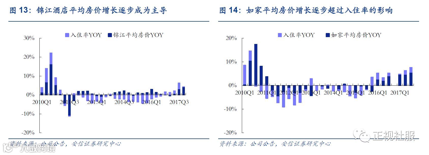 2010年Q3三大国内酒店集团RevPAR增速达到最大化,主要原因是酒店提价主导。2010Q1-Q3,华住、如家、锦江平均房价增速分别为2.37%/12.64%/25.29%、0.63%/10.63%/17.39%、1.53%/6.91%/16.39%,10Q3Revpar增速分别高达21.05%、16.56%、24.28%。而酒店提价背后的主要是因为入住率均已达到90%以上,17Q3华住、如家、锦江的入住率分别为95%、96.70%、91.70%