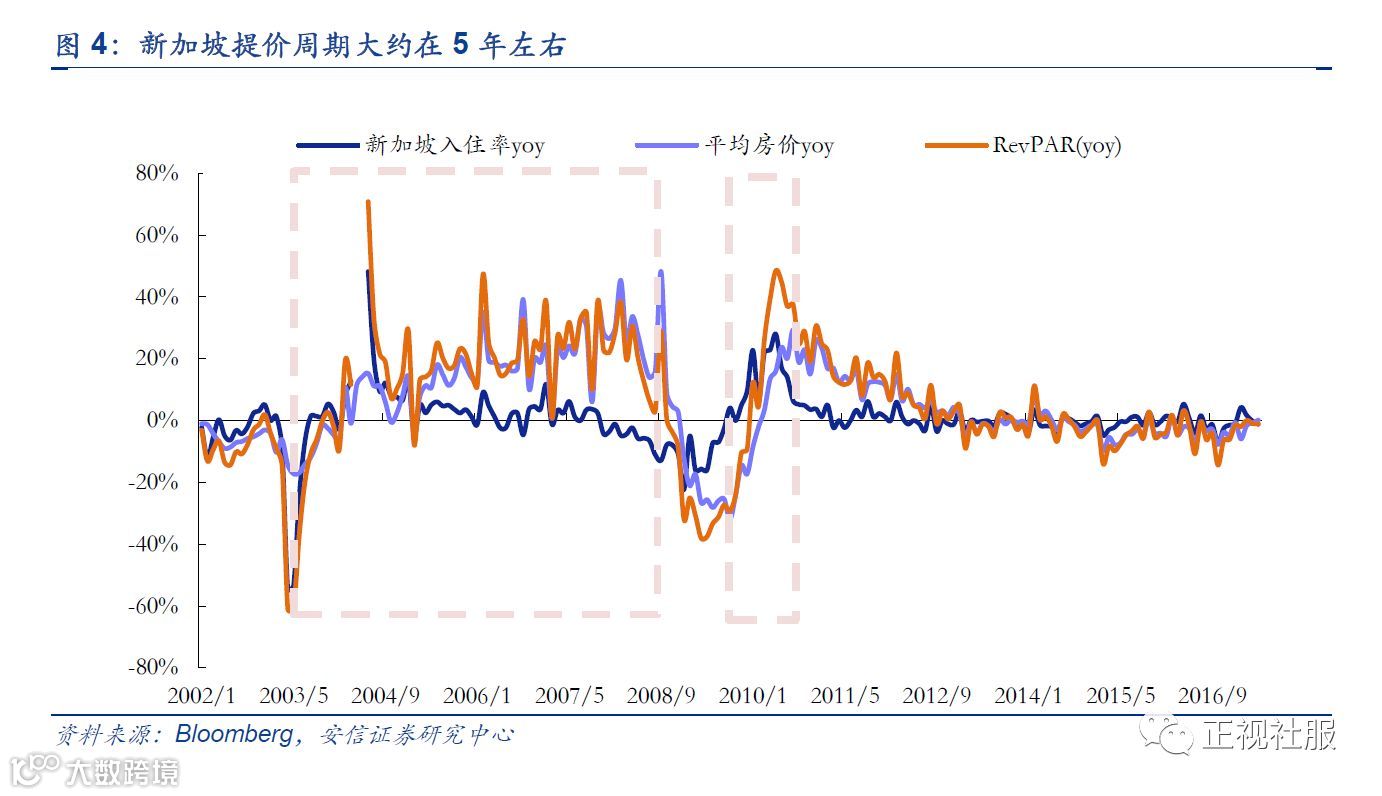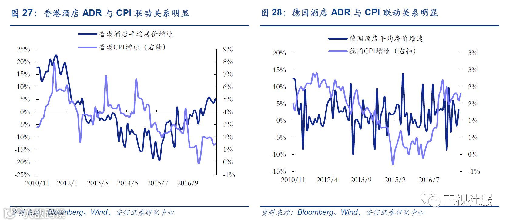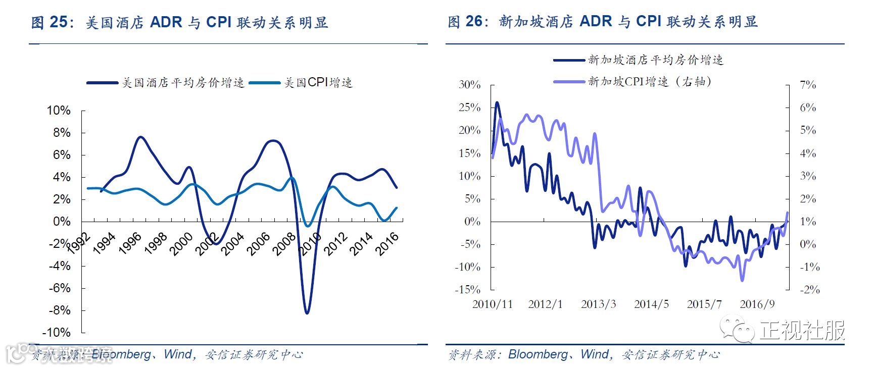CPI亦为ADR增长的重要影响因素。从美国平均房价增速与CPI增速关系看,两者存在明显的联动,CPI增长带动平均房价增长。2001-2006年,美国提价周期期间,CPI增速与平均房价增速相关性高达0.8,期间美国CPI上涨14%,平均房价上涨15%。从新加坡、德国、香港等地ADR增速与CPI增速看,两者关系联动关系亦非常显著。