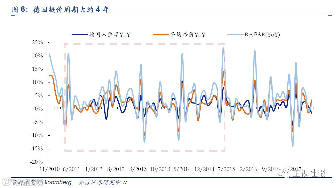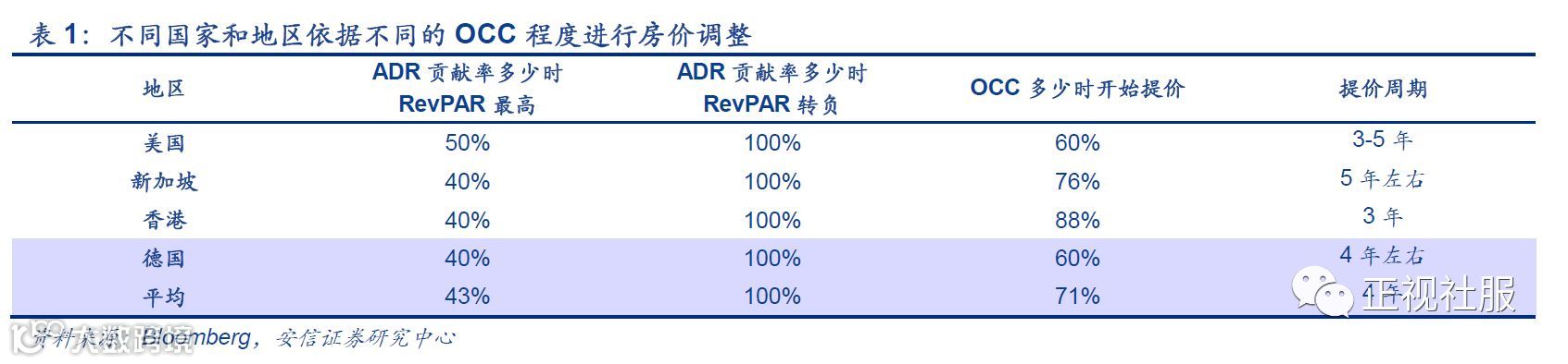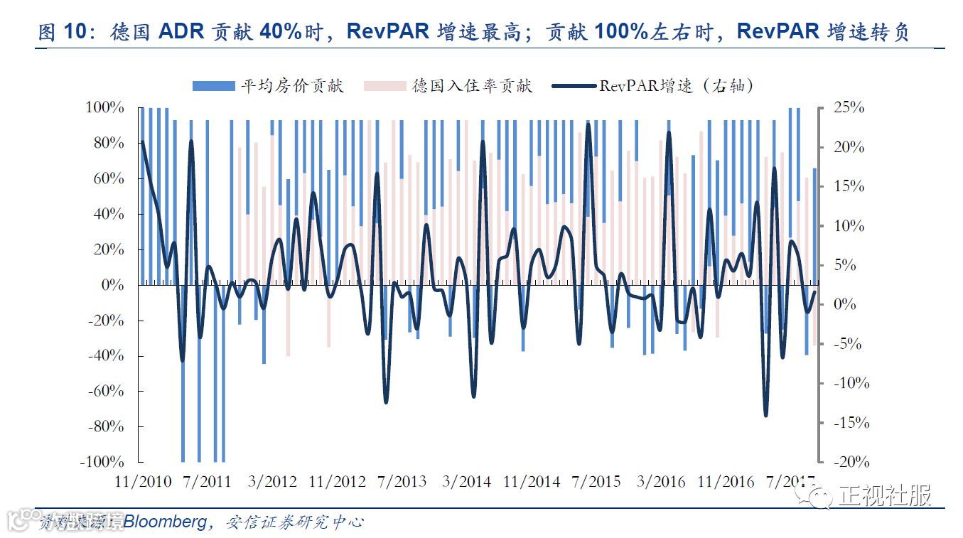 当平均房价对RevPAR增长的贡献率达到100%左右时,预示着提价周期即将结束。平均房价与入住率之间存在制衡关系,一般来说平均房价上调会导致入住率下降,平均房价下行会带来入住率上升。根据美国、德国、新加坡、香港平均房价和入住率对RevPAR增长的贡献率变化看,当平均房价的贡献率达到100%附近时,平均房价增长对需求的负面效应开始放大并逐步成为主导,表明RevPAR增长将由负转正,提价周期即将结束。