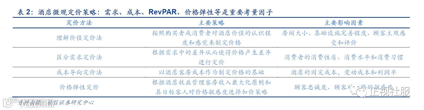 酒店公司微观定价策略亦是影响平均房价的重要因子。酒店微观定价策略主要包括理解价值定价法、区分需求定价法、成本导向定价法、价格弹性法等,通过比较,可以发现成本、客户需求及其结构、价格弹性等都是酒店集团定价时所考虑的重要因子。