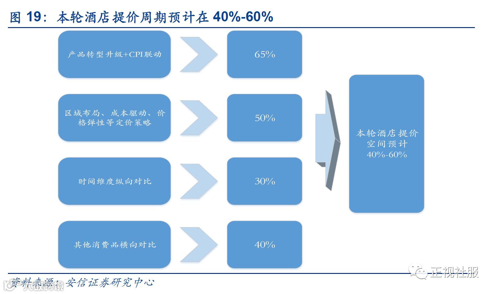 本轮平均房价提升空间预计在40%-60%。综合宏观、中观两大层面,供需及其结构变化、定价策略(成本驱动、需求驱动等)、历史平均房价纵向对比、与其他消费品横向对比(其他消费品近年来涨幅对比、国际同类产品价格差距对比)等四大维度,我们判断我国酒店业提价空间大约在40%-60%。