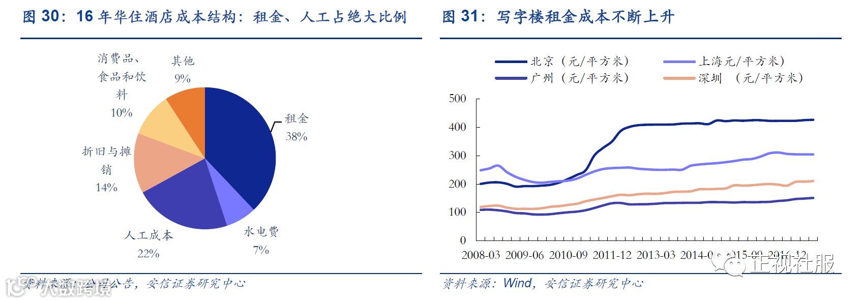 ■ 成本驱动策略:租金、人工等成本上升,将倒逼平均房价上涨。租金、人工成本是酒店经营成本的重要组成部分,以华住为例,2016年,租金和人工成本约在华住酒店成本的60%。2008年以来我国房价出现大幅上涨,导致租金成本明显上行。以北上广深四地写字楼租金为例,2008年以来,四地写字楼平均涨幅达39%。