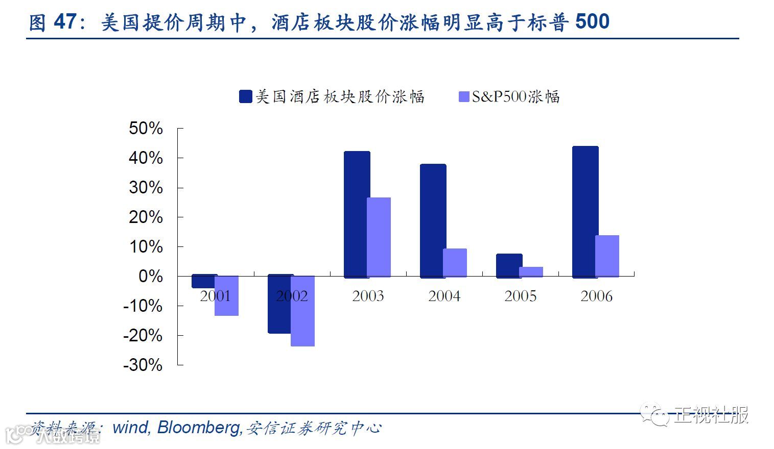 美国酒店提价周期,酒店板块二级市场表现优秀。以2001-2006年美国酒店提价阶段为例,可以看到美国酒店板块录得绝对收益142.98%,同期标普500收益23.54%;年化看,2001-2006年酒店板块录得年化绝对收益19.43%,年化超额收益15.11%。
