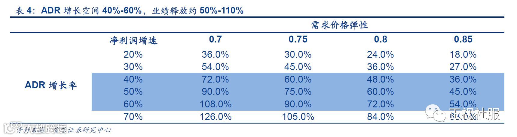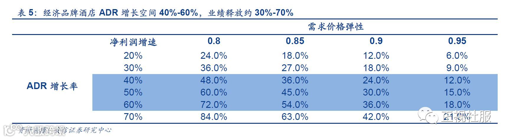 ■ 由于中端酒店消费者价格弹性相对较小,因此业绩弹性更大。中端酒店品牌酒店平均房价提升40%-60%,预计带来业绩增长85%-160%。