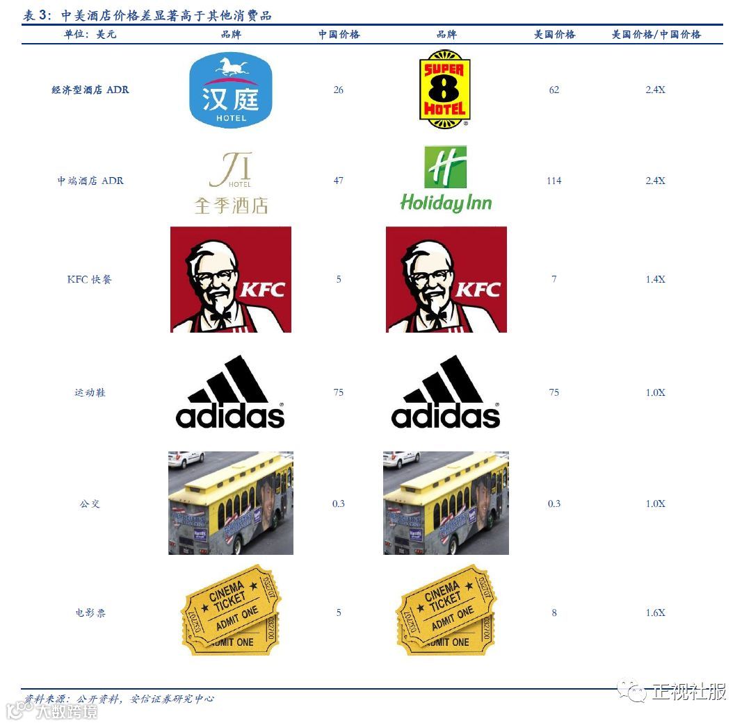 与美国同类消费品的相对比价效应看,我国酒店平均房价与美国平均房价差距明显高于其他消费品类,未来提升空间大。国内经济型酒店汉庭的价格约26美元,同类品牌速八美国的价格达62美元,美国价格/国内价格比高达2.4;中端酒店假日酒店平均房价亦是国内中端品牌酒店全季酒店的2.4倍。而其他消费品类如快餐KFC、运动鞋ADIDAS、电影票价等美国的价格约为国内的1-1.6倍,差距相对较小。