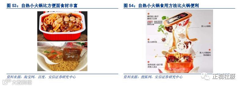 自热小火锅:速食场景丰富化和正餐场景便利化的最佳结合点。一方面,在旅游出行等速食场景,随着新生代消费群体的崛起,消费者对生活品质的要求提升,传统的方便面已无法满足消费者需求,方便食品逐渐多元化、丰富化;另一方面,在正餐消费场景,随着城市生活节奏的加快及“懒人”经济的兴起,消费者需要更加便利的选择。其中,火锅餐饮受众广,但其涮煮的食用方式耗费时间较长,便利型火锅餐饮存在着巨大的发展空间。与方便面相比,自热小火锅食材丰富,口味更佳,与火锅餐饮相比,自热小火锅只需一杯冷水就可让消费者享受到热气腾腾的食物。随着速食场景丰富化和正餐场景便利化趋势演进,自热小火锅市场发展空间前景广阔。