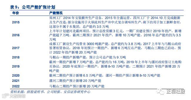 ■产能扩张奠基中长期高增长潜力:霸州、马鞍山、漯河三大生产基地投产,未来4年产能有望增多6.5倍,为中长期持续扩张做充足准备。公司的火锅底料业务未来潜力大、且休闲食品的品类和产品有望持续发展。我们认为公司三大生产基地在2019-22年预计新增的63.5万吨产能(约为18年9.8万吨总产能的6.5倍)以为未来5~10年的发展做下了提前布局,支撑长期稳健成长。公司原生产基地位于郑州和成都,旺季生产供不应求(2015年成都产能利用率95.4%,郑州基地产能利用率近80%)。公司在旺季需委聘第三方生产商协助生产(2013/14/15年生产销售成本占销售成本总额的0.8%/4.4%/13.2%),并至2017年成都新增0.3万吨产能、18年建设并投产马鞍山一期新增产能6万吨,缓解产能需求。目前,公司已布局华北、华中和华东,建设霸州、马鞍山和漯河三个生产基地。1)霸州项目:一期已于2018年底建设完工,预计将于2019年底投入量产,预计释放7万吨产能,二期将在2020年完工,预计新增6.5万吨产能;2)马鞍山项目:公司2017年上半年签订马鞍山项目一期,2018年8月签订安徽马鞍山项目二期,目前,马鞍山一期项目已于2017年底开始试生产,带来产能6万吨。二期预计将在2022年建设投产,新增20万吨产能;3)漯河项目:2019年上半年于河南漯河签订土地购买协议。漯河一期将于2020年建设完工,预计新增8-10万吨产能,二期将于2021年建成,预计新增20万吨产能。