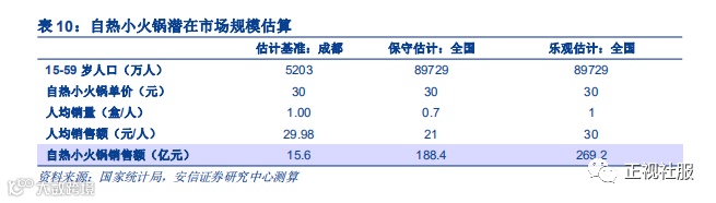 ① 保守估计:假设成熟市场环境下全国潜在消费人群每年消费0.7盒自热小火锅,结合2018年我国15-59岁人口数89729万人,自热小火锅潜在市场空间188.4亿元;