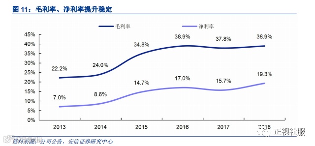 费率良性发展,净利率增长稳健。公司行政费用率历年保持在5%以下,行业中保持较低,主因管理体系优异,效率较高。18年行政费用率上升1.5pct至6.1%,主因18年批准授予151万份限制股,以及霸州工厂的筹备和马鞍山工厂的正式开业运营。公司经销费用率保持稳定,2018年经销费用241万,经销费用率9.0%,下降1pct。公司受益关联方业务,宣传促销和业务推广费用较低,经销费用率低于行业。2013年以来,公司毛利率和净利率稳步提升,2018年毛利率38.9%,净利率19.3%。