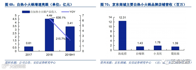 公司小火锅营收领先,未来市占率有望继续提升。公司在行业发展初期充分享受品牌红利,占据市场竞争有利地位,叠加公司线下渠道布局领先并不断加深,小火锅市场表现亮眼,产品2017年上线,2018年即取得4.49亿元收入,同步增速636.1%,2019年上半年实现收入3.41亿元,同比增速215.7%。从行业看,我们统计了京东商城火锅自热排行榜单中上榜品牌店铺中自热小火锅营收总和,其中海底捞品牌热销的有四款产品,营收总计12.31百万元,其次是小龙坎热销两款产品,营收1.43百万元,自嗨锅和蜀姑娘分别营收1.43和1.39百万元。从京东商城的销售情况看,海底捞品牌自热小火锅遥遥领先。