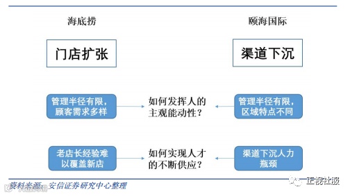发展诉求:门店扩张vs渠道下沉。海底捞的不断壮大依赖于餐饮门店的扩张,带来更多的营收,而颐海国际第三方业务的扩张则依赖于销售渠道的不断扩张下沉,其中以经销渠道为主。在扩张的过程中围绕“人”这一关键要素产生两个问题: