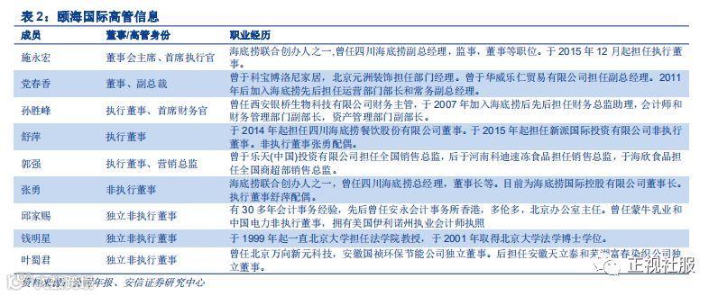 公司实控人为张勇夫妇,股权与海底捞高度捆绑。颐海国际实施“同股同权”结构,所有股东“一股一票”。根据公司最新年报,截至2018年12月31日,公司董事及最高行政人员共持股552,070,513股,其中舒萍女士和张勇先生通过其全资持有的信托机构ZYSP YIHAI Ltd.持股372,547,021,占比35.61%,为公司实控人;施永宏先生通过其间接全资子公司SYH YIHAI Ltd.及LHY YIHAI Ltd.持股177,243,492股,占比16.95%;Vistra Trust (HK) Ltd.为JLJH YIHAI Ltd.的受托人,后者根据受限制股份单位计划持有76,148,000股;根据港交所最新数据,UBS Group AG共持股63,462,869股,合计占比6.06%,占比较2018年底年报披露6.26%有所减少。张勇夫妇还是海底捞的实控人,通过全权信托直接及间接持股合计57.7%(张勇44.01%,舒萍13.66%),施永宏、李海燕夫妇合计持股27.3%。从股权架构上看,颐海国际和海底捞高度捆绑。