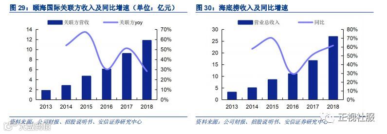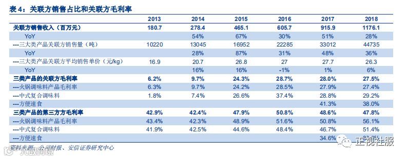 颐海国际是海底捞集团在中国的核心火锅底料产品供应商。公司向海底捞销售定制产品(利用海底捞配方生产供门店自有消耗)及海底捞零售产品(利用公司配方生产于海底捞火锅餐厅展示及售予客户外带),同时公司向海底捞联属公司蜀海供应零售及定制调味品,通过蜀海销售渠道将该产品售予B端餐饮服务供应商。截至2018年,公司关联方销售收入达到11.76亿元,同比增长28%,占收入比44%,来自火锅调料、中式复调、方便速食产品关联方的销量同比增长36%达到4.47万吨,平均销售单价为26.3元/kg。