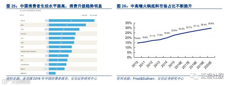 消费者健康意识提升,中高端火锅调味料兴起。随着我国城镇化推进,人民生活水平不断提高,消费者从单纯追求价格低廉、实惠型消费逐步转向注重品质和体验型消费,更加关注饮食的品质和健康。根据麦肯锡2016年中国消费者调查,47.8%的用户表示更注重商品的品质,这些用户更愿意在同类商品中选择品质好的,并愿意为此多付10%的消费溢价。在此背景下,火锅底料行业也逐渐产品升级,趋向中高端,以满足越来越多消费者的品质需求。根据Frost&Sullivan的数据,2010年火锅底料市场中高端火锅底料占比为14.6%,至2015年达到22.6%,预计2020年占比将达29.6%。