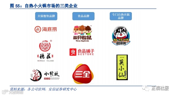 各类品牌扎堆,主要有三类参与者。良好的市场前景吸引众多企业在自热小火锅市场布局加码。根据《新零售百科》统计,截至2018年底市面生产自热火锅的品牌超过400家,主要包括三类企业:1)火锅线下餐饮企业可以自身生产底料并提供食材,其本身的品牌也有助于新产品的渠道推广,成为自热火锅的主要市场参与者,如海底捞、德庄、大龙燚、老城南等;2)增加自热锅品类的食品品牌包括三只松鼠、良品铺子、康师傅、三全等;3)专门做自热火锅领域的新品牌,如自嗨锅、莫小仙等。