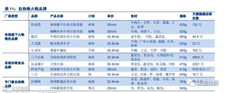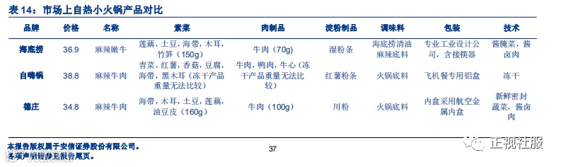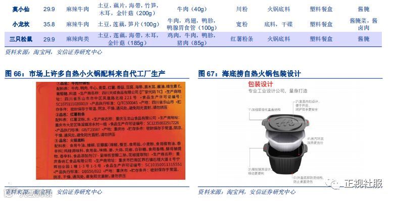 海底捞自热小火锅在包装、用料和口味方面优势领先,口感方面态度谨慎。我们从目前市场上的三类竞争者中选取5家知名自热小火锅品牌(火锅品牌:德庄,小龙坎;专门自热小火锅品牌:自嗨锅,莫小仙;食品品牌:三只松鼠)来和颐海的自热小火锅产品进行对比,选取比较的产品为经典款麻辣牛肉。