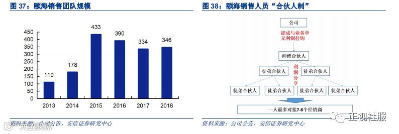 ■渠道驱动力:“合伙人制”深度绑定销售并实现提效,“裂变制”下师徒合作助力渠道快速下沉。目前部分市场观点认为颐海“合伙人裂变制”是海底捞“师徒制”的复制,但我们认为颐海的模式为深度改良后并更适应其自身发展需求的新模式,未来会不断根据公司的发展阶段做出及时调整,其背后制度的制定团队(以张勇先生为首的集团高管团队)为颐海制度优势的基石,未来有望一直延续。公司在近年来不断发力第三方业务,销售人员重要性凸显。与海底捞高速发展时遇到的困难一样,颐海在渠道下沉过程中同样面临管理半径及新老渠道利益冲突等难点。对此,颐海沿袭并改进了海底捞的解决方案:1)销售主观能动性方面:颐海在18年引入“合伙人制”,业务员分享业务单元利润并给予渠道费用使用权限,并在19年进一步引入PK制强化新区的需要扩张;2)人才供应方面:颐海19年开启“裂变制”,经选拔的A级合伙人可带徒弟并分享利润,由经营丰富的师傅负责开拓新市场,徒弟负责维护师傅开拓好的成熟市场积累经验,作为核心人才培育。该模式下,公司开拓的经销商数量截止19H1已突破2000家,未来有望继续向三四线下沉,公司主要品类底料和调料渠道方面存在较大共性,强渠道驱动力将为公司不同品类产品扩张深度赋能。