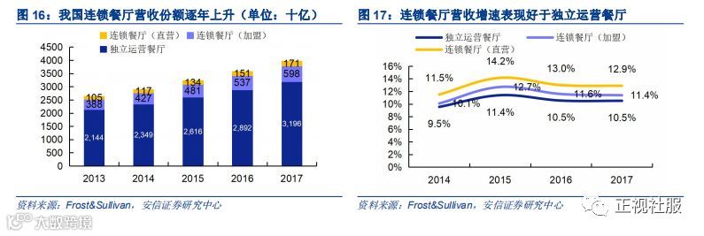 下游餐饮门店连锁化带来对复合调味料的需求,火锅餐饮持续火热,趋势尤甚。目前,我国的餐饮市场集中度较低,以独立运营餐厅主导。但是连锁餐厅相比独立运营餐厅增速更快,份额不断提升。根据Frost&Sullivan的数据,2013-2017年,我国餐饮行业连锁餐厅(含自营与加盟)整体营收从4928亿增至7685亿,占比从18.7%上升至19.4%。从增速看,自营连锁> 加盟连锁>独立运营。下游门店的连锁化和规范化经营带来对标准化复合调味料需求的快速增长。尤其对于具有一定口味特色要求的连锁餐饮企业,口味的标准化和稳定性是其快速扩张所具备的重要条件。门店使用单一成分调味料自行配制口味不稳定,难以满足需求,复合调味料将逐渐成为下游连锁餐饮门店的优先选择。